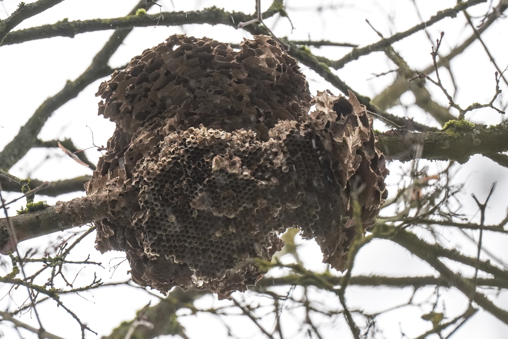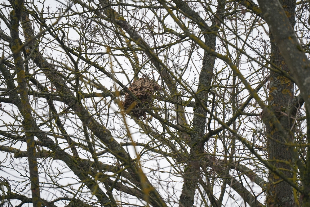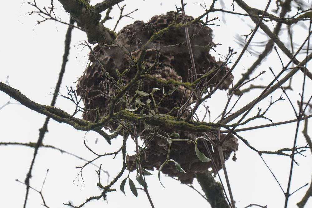 Un nid de frelons asiatiques à pattes jaunes en milieu urbain à Saverne, rue du Zornhof.Il a été signalé le 28 février 2026. Il est dans un état de délabrement avancé.Chapeau à celle ou celui qui a eu l’œil 🙂
